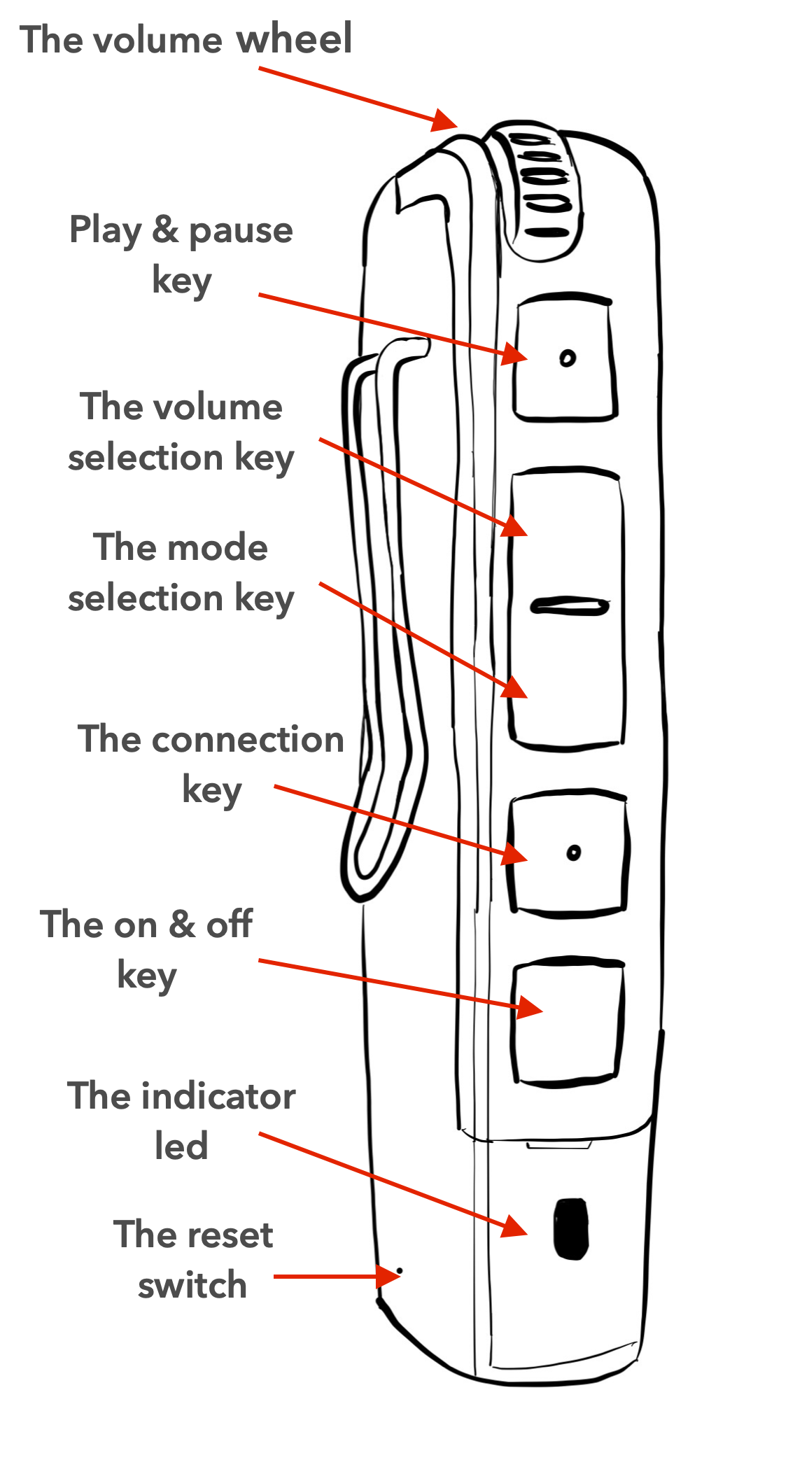 The play & pause button is the top-most key on the BlueLink – right under the volume wheel
