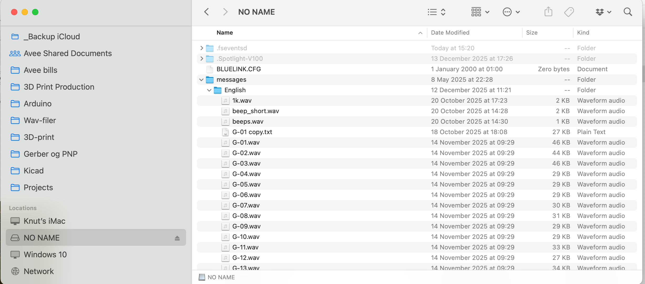 The audio messages, which are in the wav audio format, are placed in the messages/English subdirectory on the Bluelink disk – just like in the image below. Please note that this screenshot is from a Mac, but it looks almost the same on a Windows PC. I think.